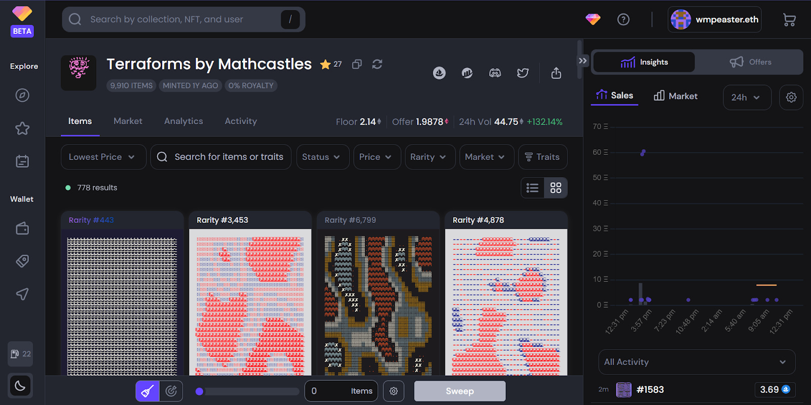 Clicking on a specific NFT project will bring you to a bespoke dashboard for that collection where youâll be able to review the projectâs main links, aggregated listings, real-time market activity, current offers, sale insights, and more. Of course, here you can also sort items with popular filters like âLowest Priceâ or by categories like âRarityâ and âTraits.â