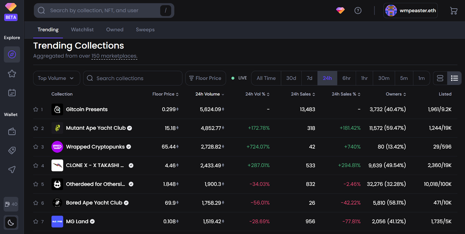 The âMarketâ tab will bring you to an overview dashboard where you analyze the trading activity around NFT collections that are trending, that youâve watchlisted, that you own, or that have recently been âsweptâ with batch buys. Here, you can also search out activity according to minimum or maximum floor prices or according to timeframes, e.g. from âAll Timeâ stats to â1 minuteâ stats.