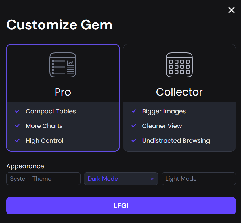 Also, keep in mind that on Gem V2 you can go into your settings and use the âCustomize Gemâ option to flick between âProâ and âCollectorâ visual modes as you please.