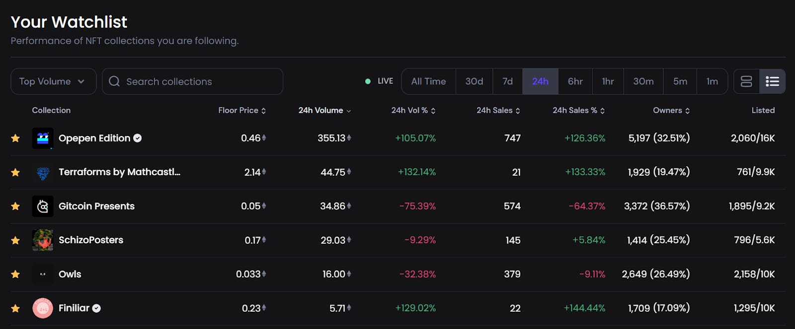 As for the âWatchlistâ tab, this is where you can curate your own list of NFT collections that you want to watch closely. You simply find and click on the star next to a collectionâs name to add or remove it from your watchlist. This resource makes it so you donât have to scroll wildly across dozens or even hundreds of NFT projects to have all the information you want closely on hand.