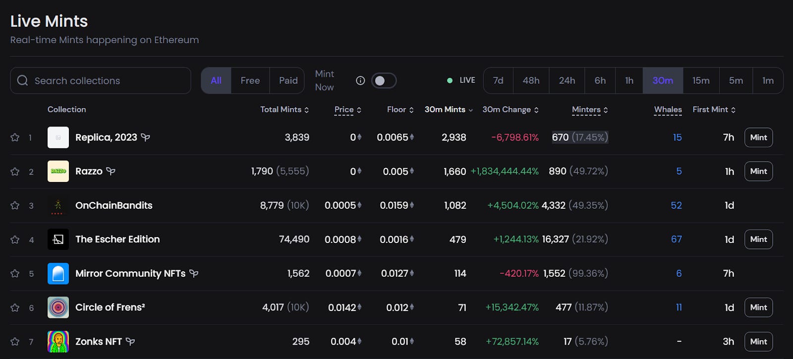 Lastly in the âExploreâ section of the navigation bar is âMints,â which provides a real-time dashboard for ongoing Ethereum NFT mints. If youâre interested in finding new mints as they happen, this resource is a great starting point â not only because it makes the discovery process simple, but also because it makes the minting process safer. This safety stems from Gem searching the chain for mint events, simulating mint transactions with a random wallet on a mainnet fork, then passing up safe mints that have passed the check.