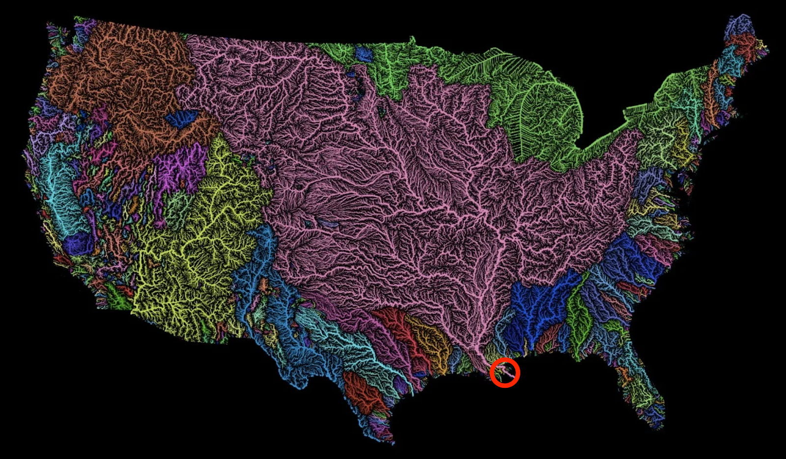 Another word for a Sink is a Basin. Below is a map of the river basins of the USA. Most notably, the Mississippi Basin in pink is one of the world’s largest basins. Any droplet of water that falls anywhere inside the pink region is assured to ultimately find itself at the point of convergence: where the Mississippi River meets the Atlantic Ocean.