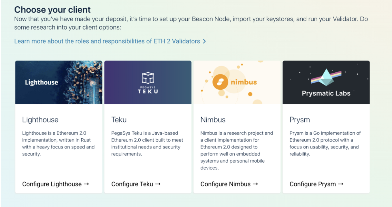 The launch of Eth2 features multiple clients, providing validators with the option of using different implementations for running their validator.