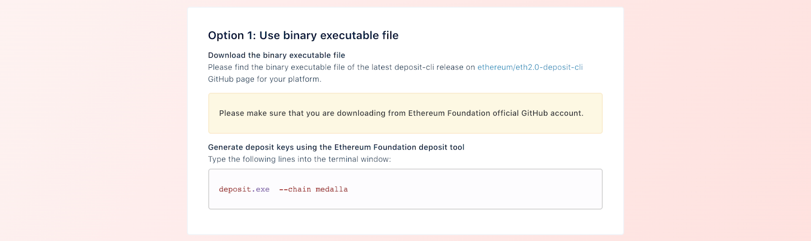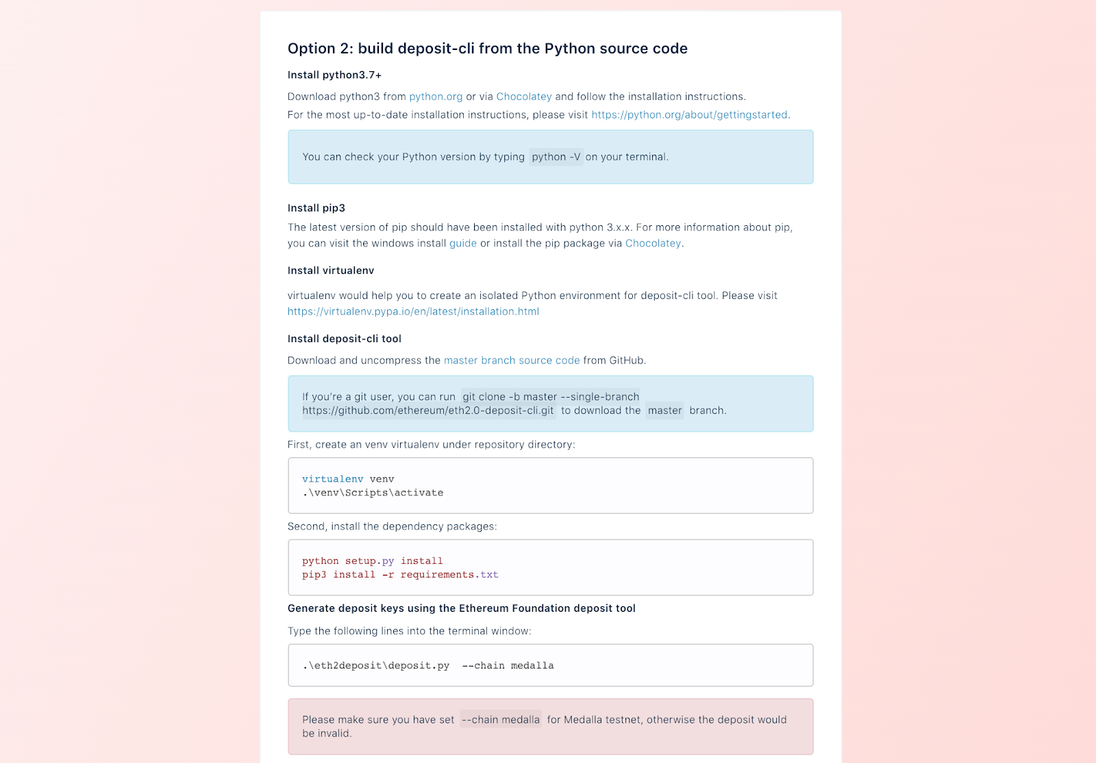 The other option is to build the deposit-CLI tool from the Python source code. You will need to follow the instructions to ensure you have all the required development libraries and the deposit-CLI tool installed.