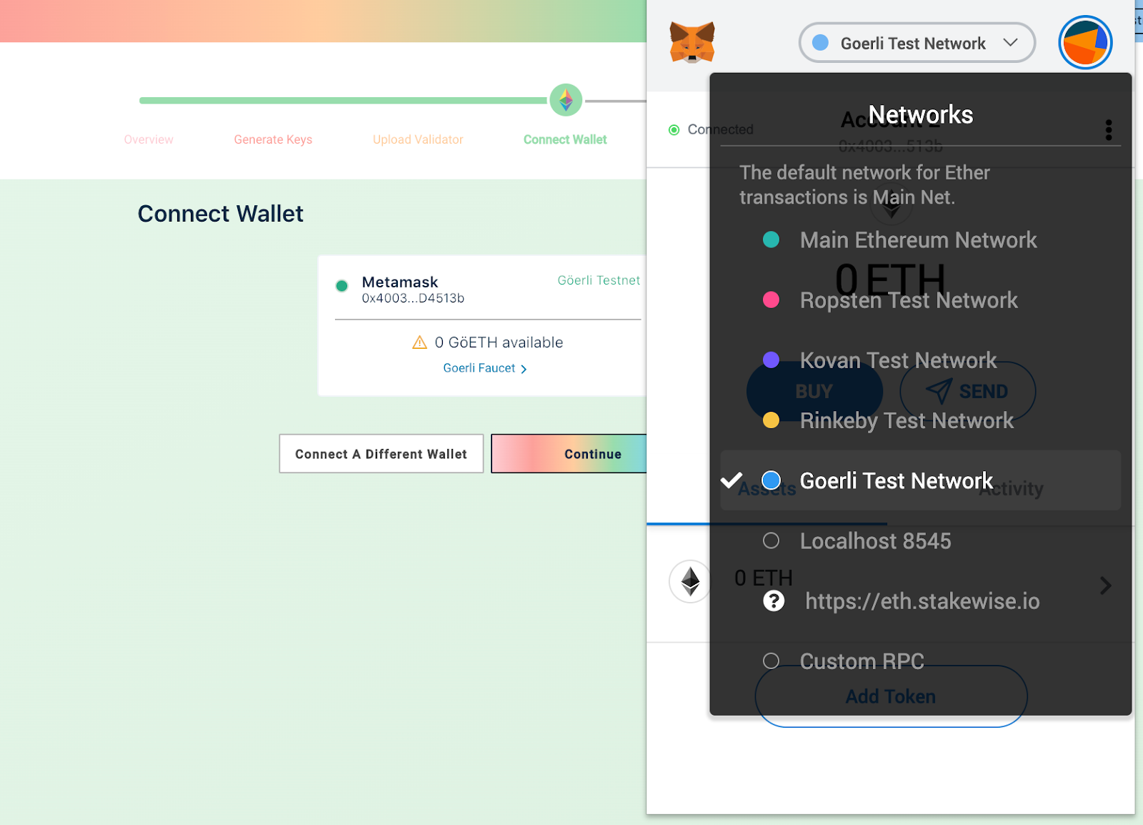 Next connect your Web3 wallet and click continue. Make sure you select the Goerli testnet in your wallet settings.