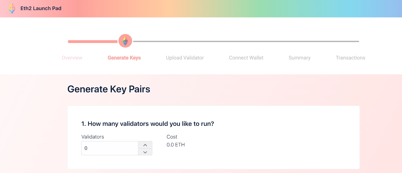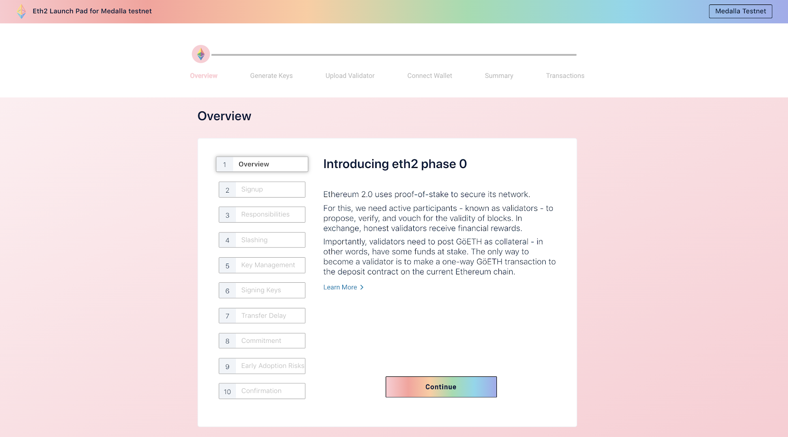 The result of this effort is the Eth2 Launch Pad, an application designed to securely guide you through the process of generating your eth2 key pairs and staking your 32ETH into the official deposit contract on the eth2 testnet and mainnet.