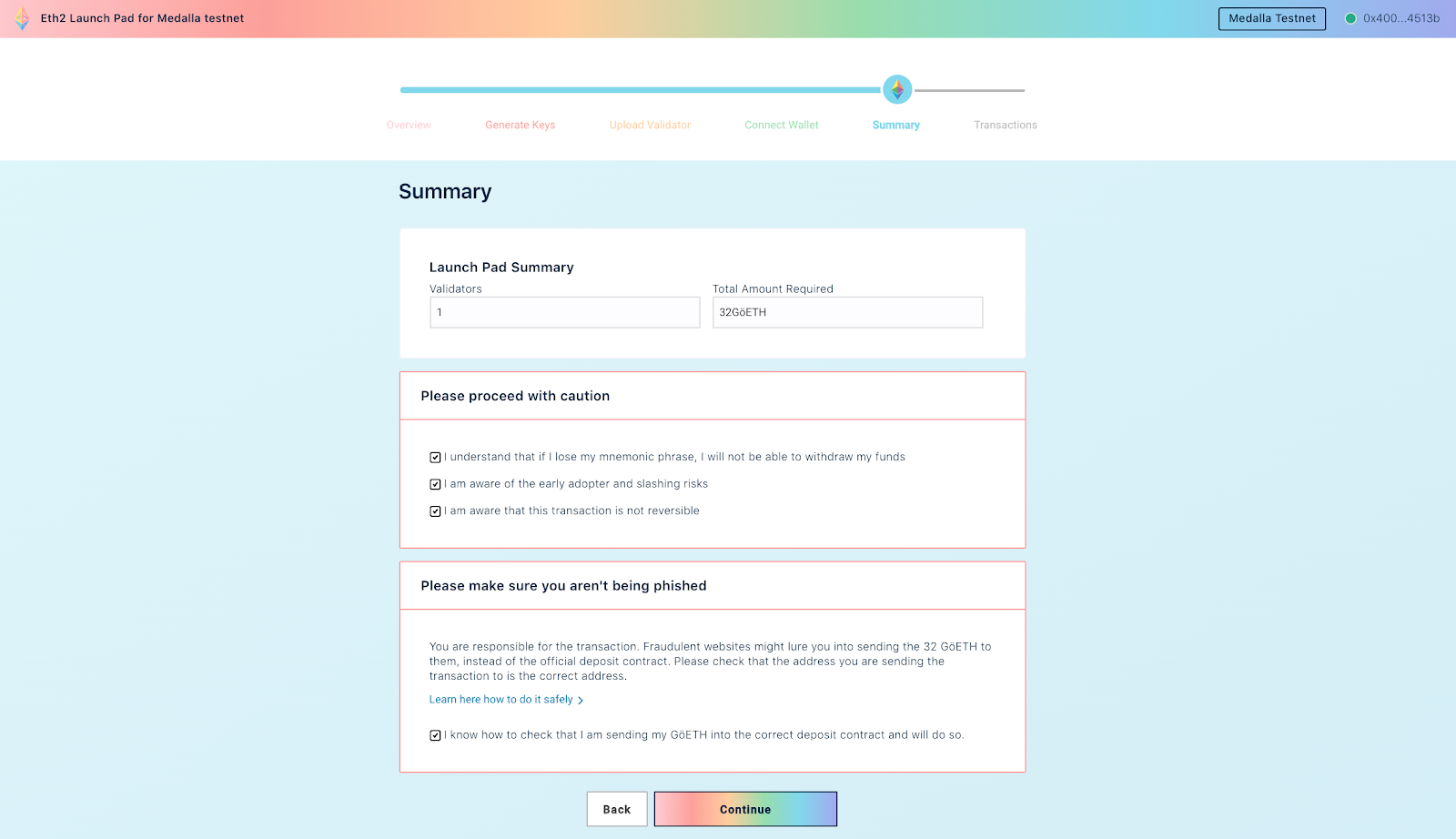 Once you have connected and confirmed your wallet address you will be taken to a summary page that displays the total amount of GoETH required to send to the deposit contract based on the number of validators you have selected to run.