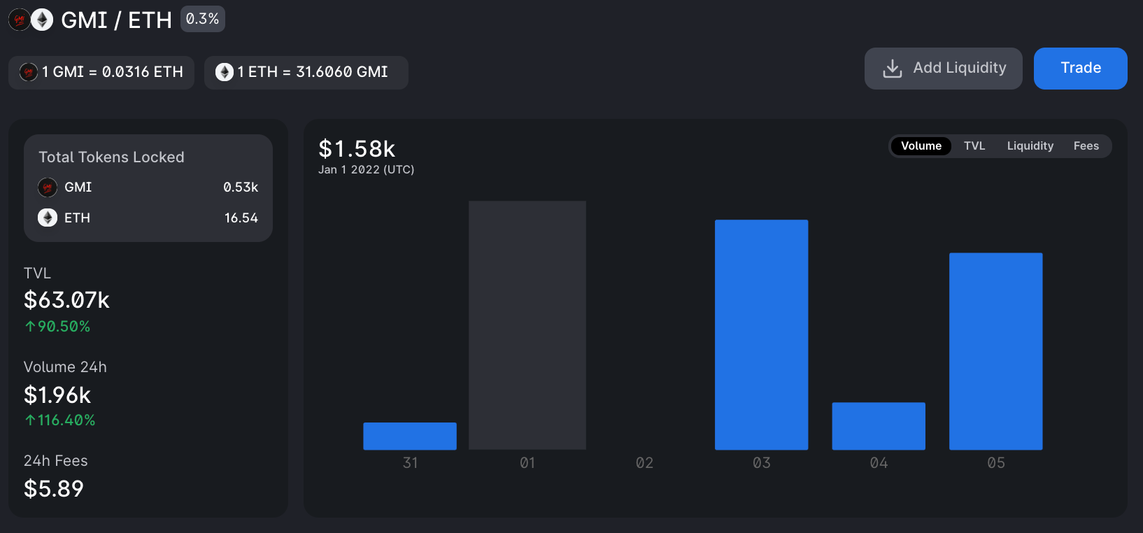 👉 Reference: GMI is currently trading at 31 GMI per ETH with the current range for most liquidity being somewhere between 15 GMI per ETH to 60 GMI per ETH.