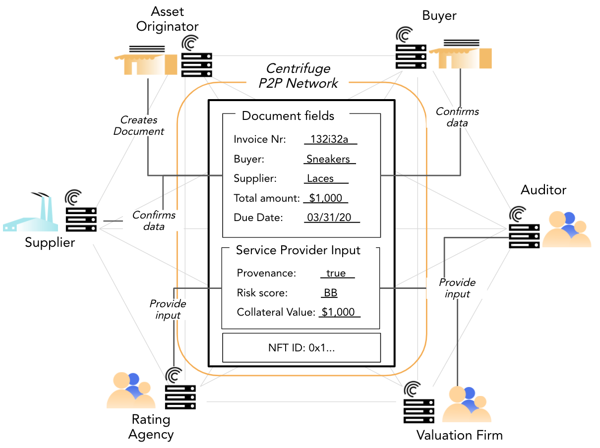 As you can see in the illustration below, Asset Originators can add Service Providers as collaborators to a document. In this case the Asset Originator has added an Auditor, a Valuation Firm, a Ratings Agency, and the Buyer as collaborators. All of the collaborators are connected through nodes in the Centrifuge P2P network.