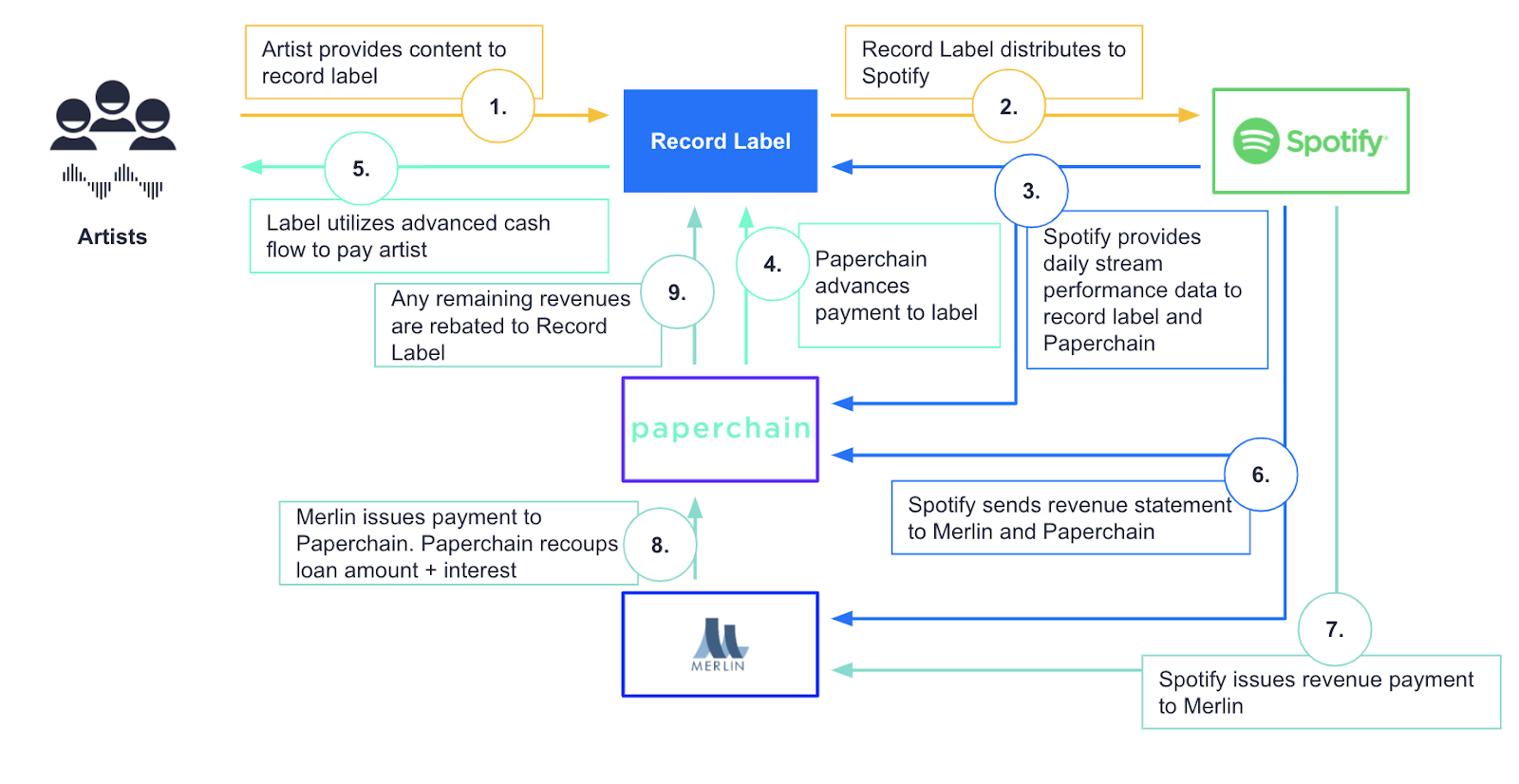 One of our first deployments is with Paperchain, which is an Asset Originator that has submitted a collateral onboarding proposal with MakerDAO. Paperchain allows musicians to get paid faster for their streamed music. In this scenario, the Musician/Record Label is the Supplier and Spotify/Merlin is the Buyer. Paperchain advances money to Supplier today and collects from Buyer in 60 days when the invoice payment is due. Here is a overview of the process:
