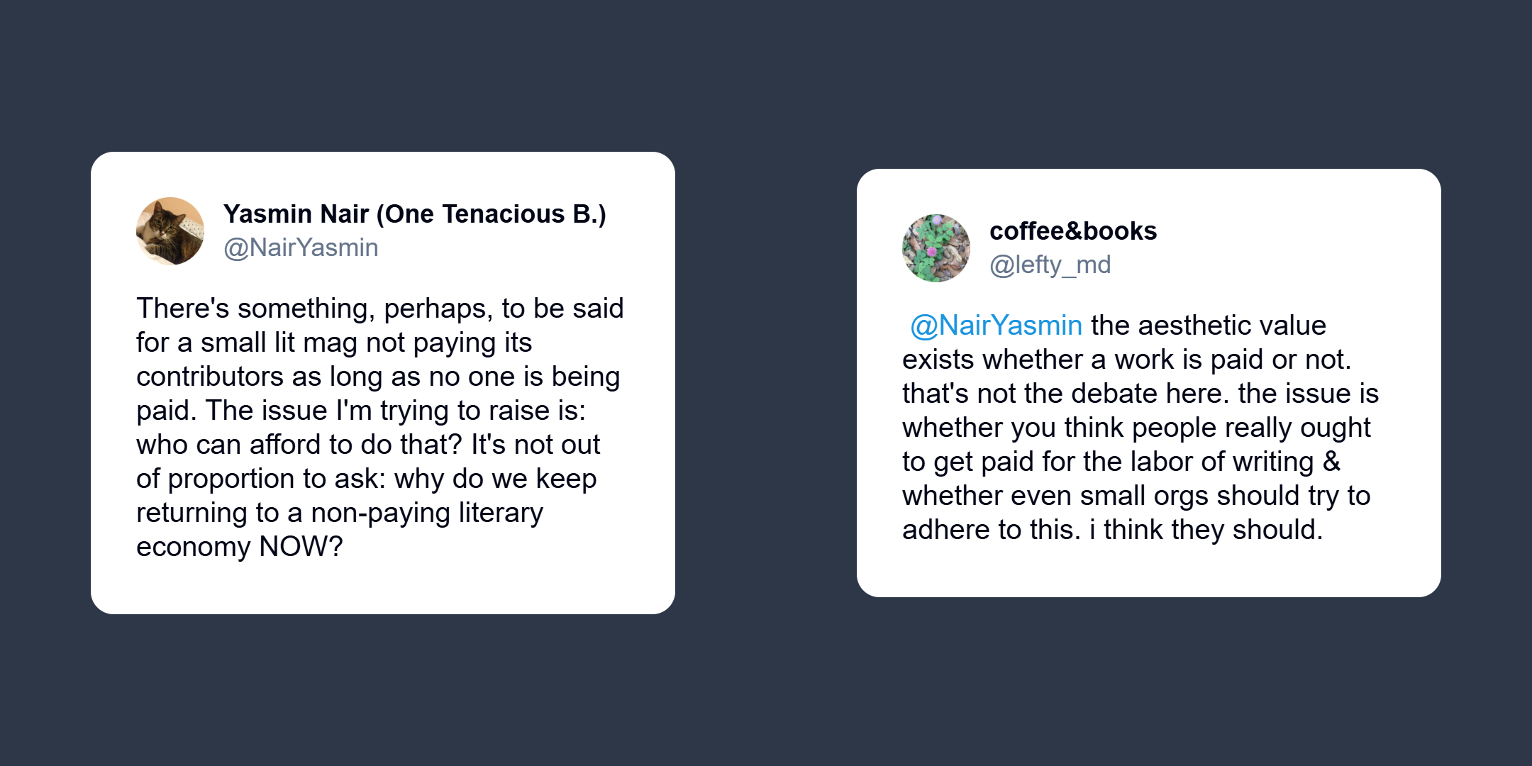 Yet fundamentally speaking, shouldn't writers be paid for their writings? That question has been at the center of a debate in Twitter literati circles over the past week. I haven't been able to trace where the discourse started, but it's led to a lot of interesting discussions.