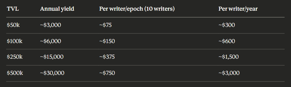 For comparison, let's say the Combinatoria vault maintained $100,000 deposits for a cohort of 10 writers, and that vault generated $6,000 (or 6% APY) in a year. That would come out to $150 per writer per epoch, or $600 per writer annually. That would be more than many lit mags pay, and the pay would scale with more deposits; 5x the deposits would lead to 5x the earnings.
