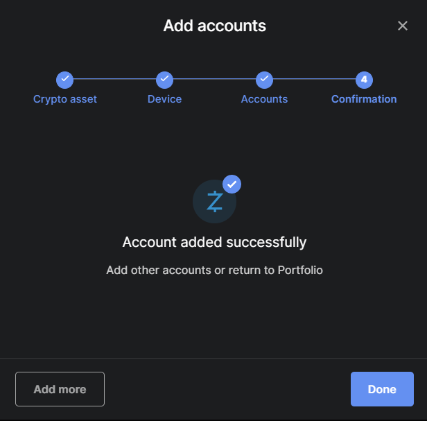 Now that your account is added, you can retrieve your public key address to tell your crypto bank or exchange where to send the asset. Click “Done” and Ledger Live will show you the new account in your Accounts tab.