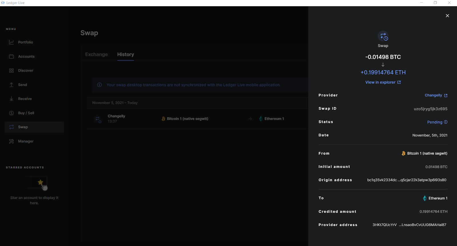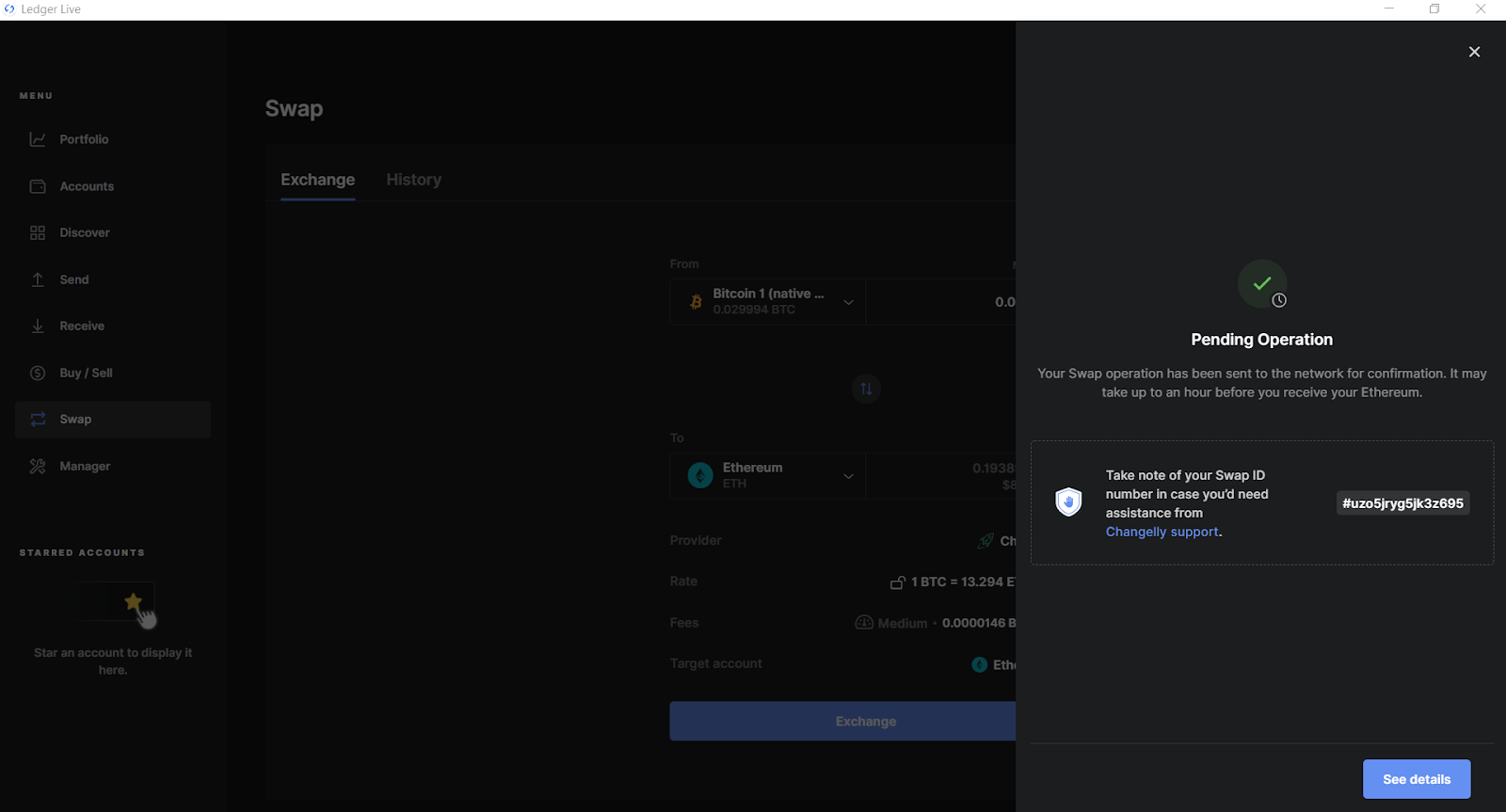- The first screen will just show the Changelly Swap ID. Ledger Live stores this info so there is no need to immediately write it down. Click on the blue button below that says “See details”. The next screen displays the Swap ID again along with status, the addresses used, and a link to the blockchain explorer page for that transaction for on-chain verification. You can retrieve this information at any time by navigating to the History tab under Swap and clicking on the transaction for which you need the details.