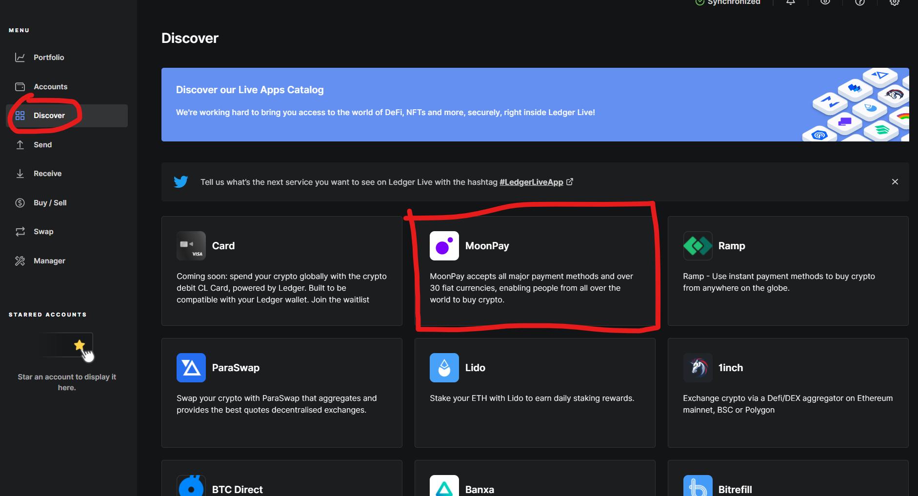 To use MoonPay to buy crypto, you need to first set up your Ledger hardware wallet and Ledger Live. We’ve covered these items in a previous post: How to set up your Ledger