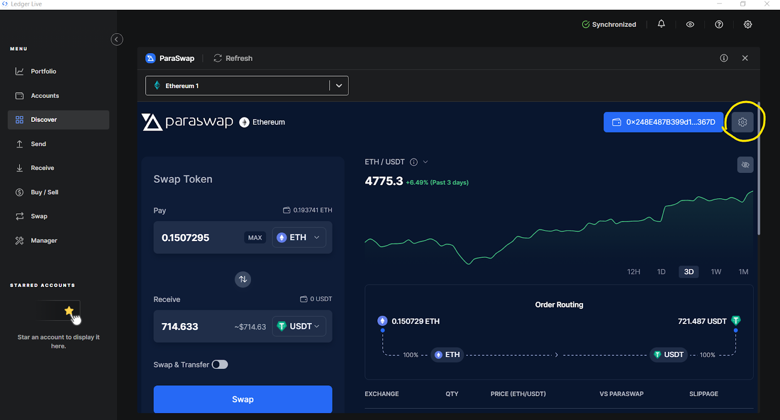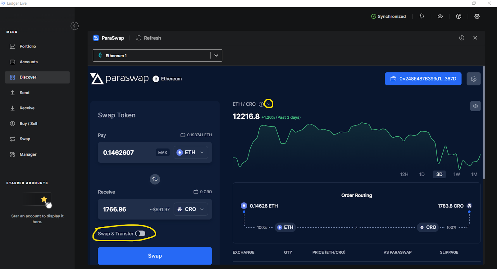 - Another great feature of the ParaSwap interface is the Swap and Transfer function. Toggle this on, and ParaSwap gives you the option to send the asset you are receiving to a different wallet address than your Ledger’s. If you plan to send the asset for which you are trading to a hot wallet for example, go ahead and do this as part of the exchange and save yourself the gas fees of that secondary transfer. In the age of super-congested Ethereum blockspace, this feature is a huge value-add!