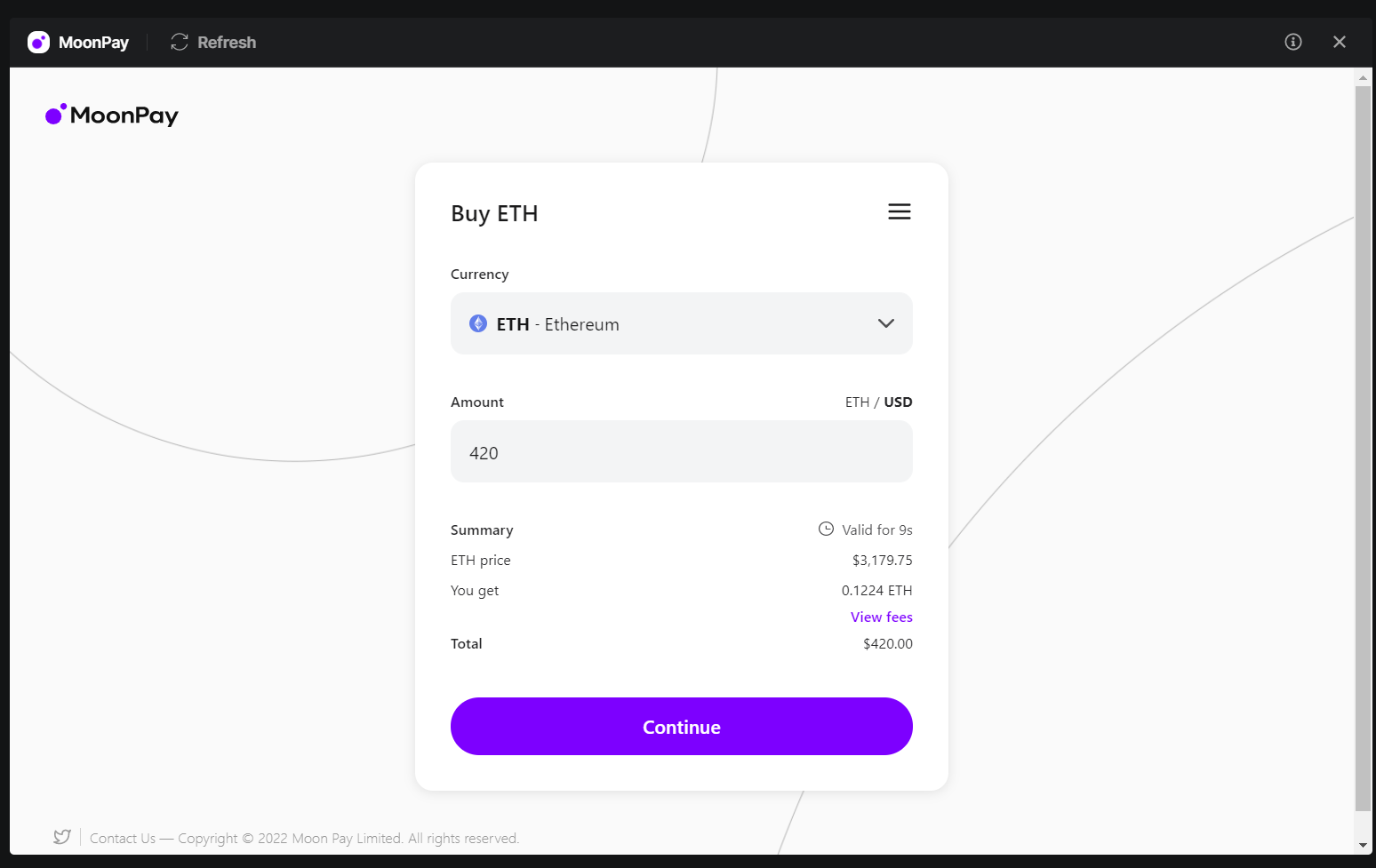 MoonPay allows you to purchase crypto using bank transfers or payment cards. Select the currency you wish to purchase and enter the amount you wish to purchase. and click continue.