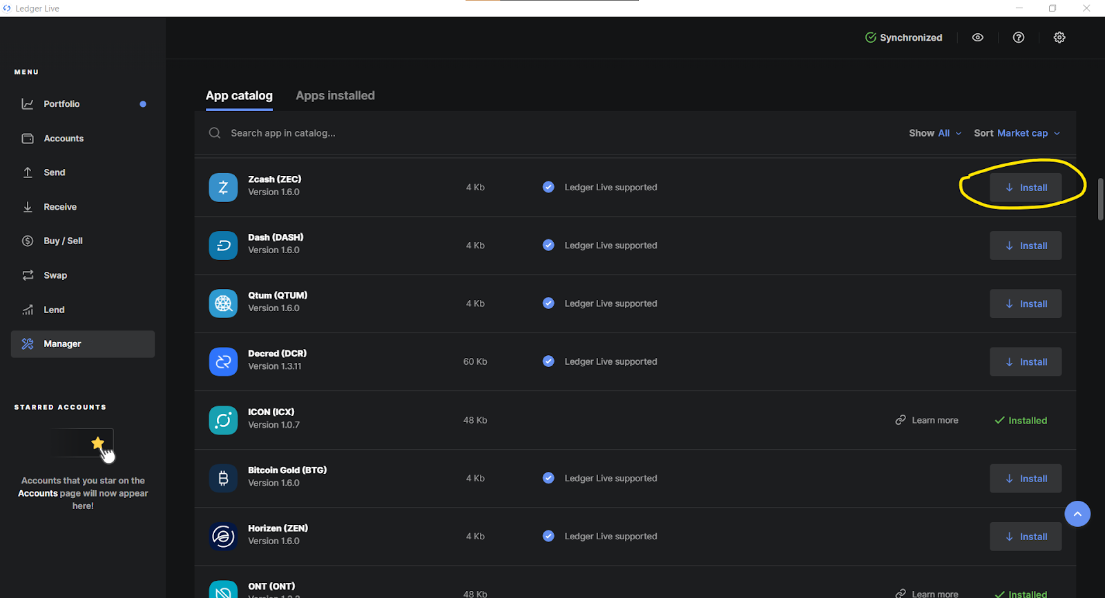Scroll down through the App Catalog and find the crypto asset you wish to add, then click the Install button on the right side of the page.