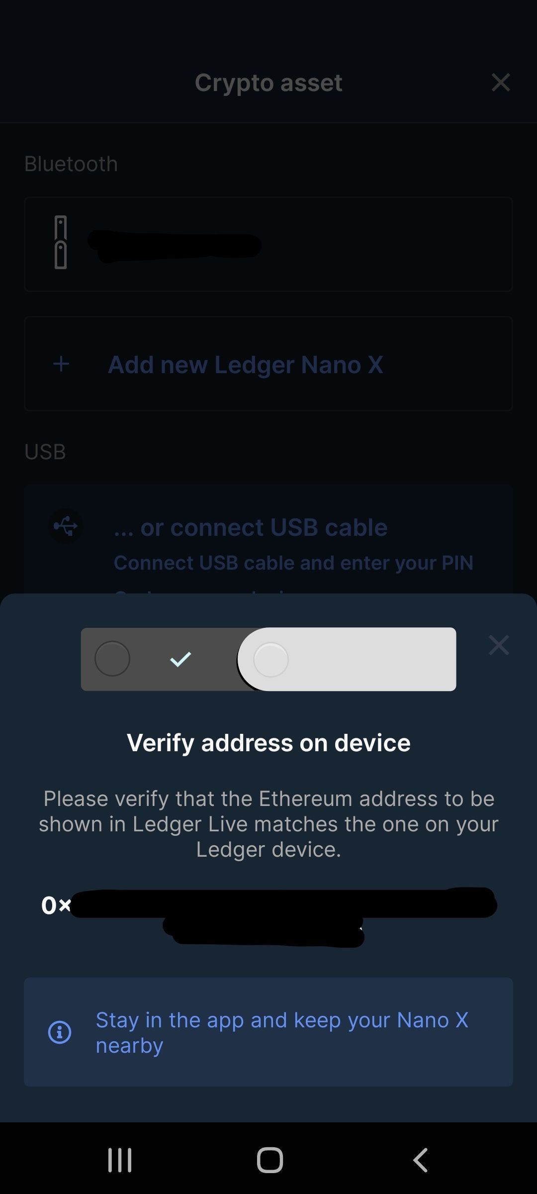 If the address shown on Ledger Live matches the address on your hardware wallet, press both circular buttons on your hardware wallet to Approve. Navigate back to your Ledger Live and your address will populate the Wallet Address section.
