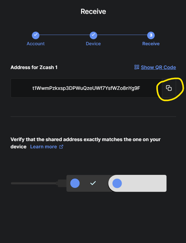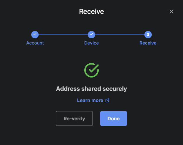 The public key has now been shared with your Ledger and you are ready to receive funds at that address. If you missed copying the address or need it again, you can click “Re-verify” or go through this receiving process again.