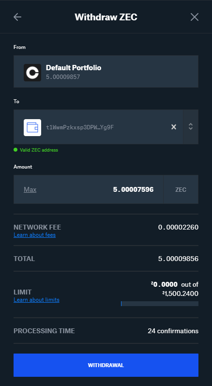 In this example, I selected the Withdraw option in Coinbase Pro, chose my example asset “ZEC”, and selected “Crypto Address” to get me to the proper window to enter the address to send to my Ledger.