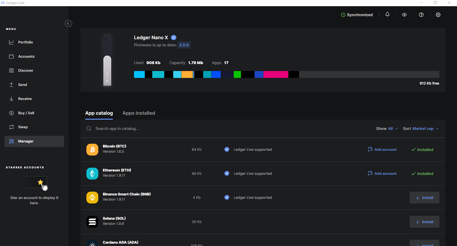 - Open Ledger Live and connect your Ledger hardware wallet to your device running Ledger Live. Unlock the wallet with your PIN, and press both buttons to allow Ledger Live to access the wallet. Go to the Manager tab to view the apps that are downloaded onto your device.