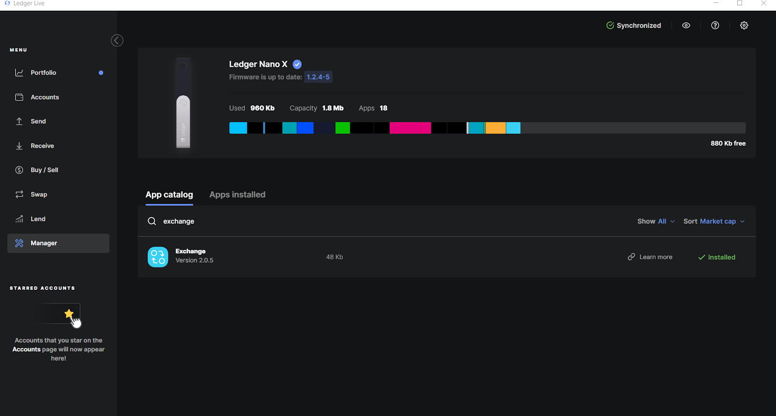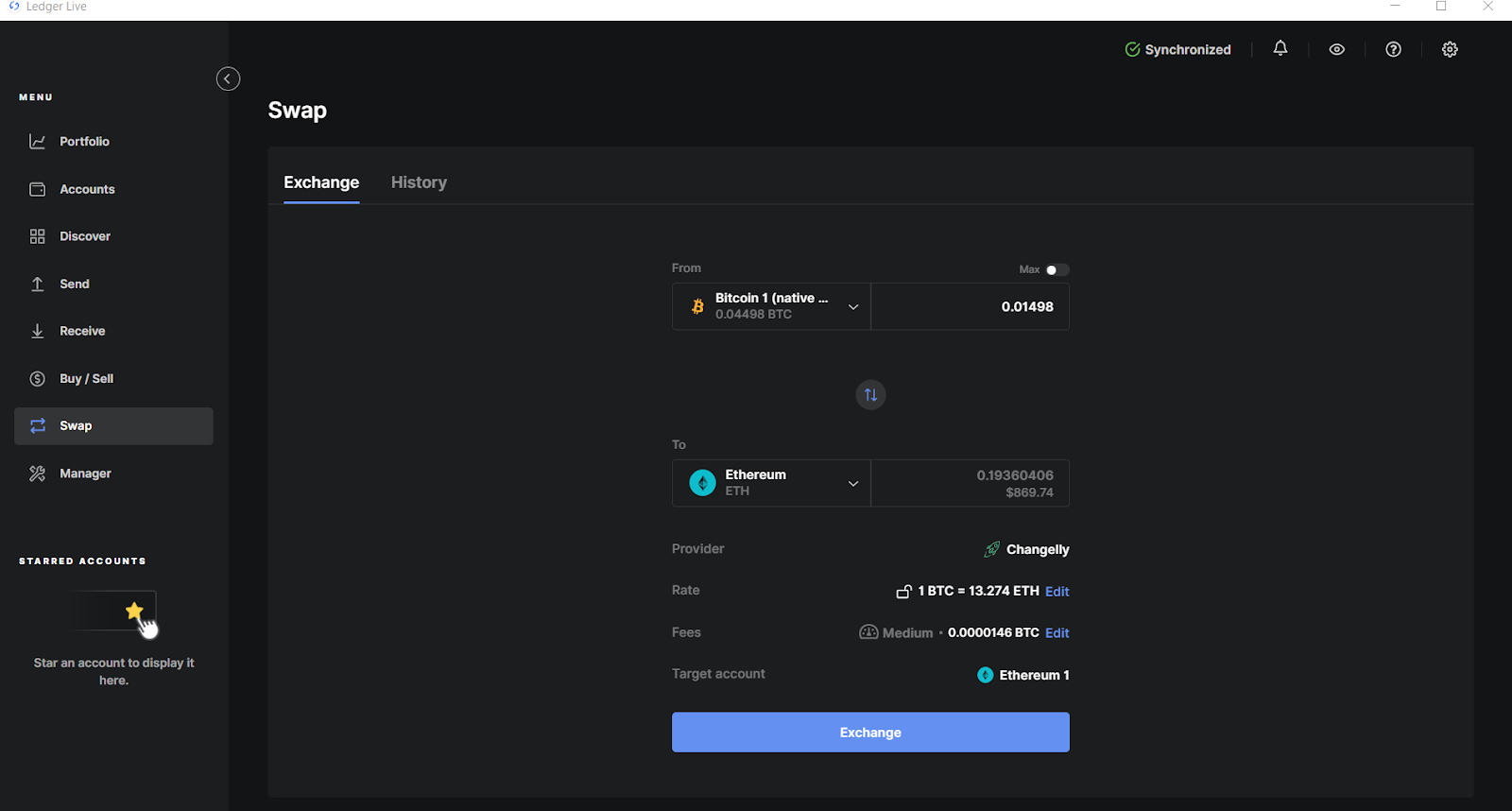 Changelly Step 4: Navigate to the Manager tab on the left side menu and install the Exchange app on your hardware wallet. This app allows your hardware wallet to communicate with the swap service Changelly, from within the Ledger Live app.