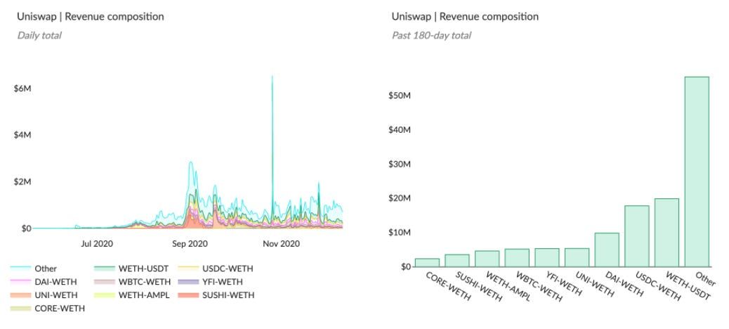 For projects that have multiple different GMV and revenue components, we’ve chosen to visualize the nine components with the most GMV and revenue during the relevant time period (i.e. 30-days, 180-days or since launch) in addition to an “Other” category. A large “Other” category would indicate that the long-tail of trading pools or lending markets generate significant GMV or revenue and vice versa.