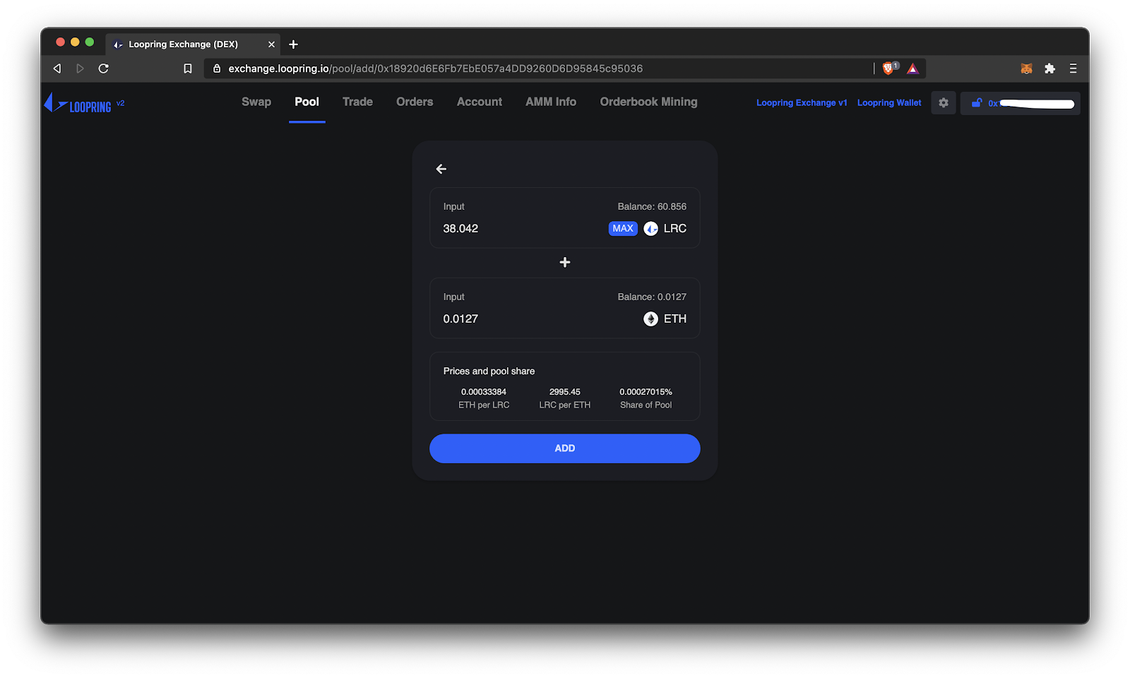 To become an LP on Loopring, head over to the ‘Pool’ tab on top, and choose which pool you want to provide liquidity to from the drop-down menu. Click ‘Add’.