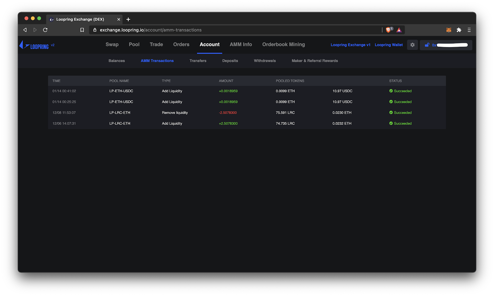 To add liquidity to a pool, you need an equal value of both assets, which gets deposited to the pool at the prevailing exchange rate of that pool. That is, if you want to become an LP in the LRC-ETH pool, you would need $100 worth of LRC and $100 worth of ETH. In future, you will be able to deposit with a single asset—we’re working on that!