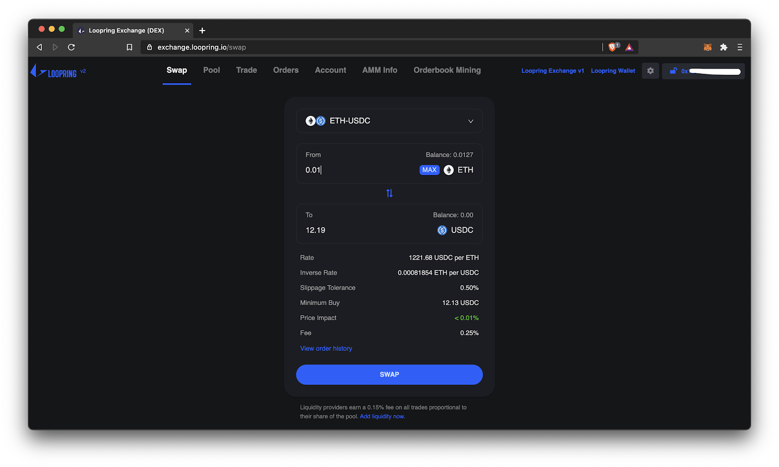 Loopring L2 supports bot types of Ethereum DEX ‘market structures’: orderbooks and Automated Market Makers (AMMs). First let’s look at swapping on the AMM.