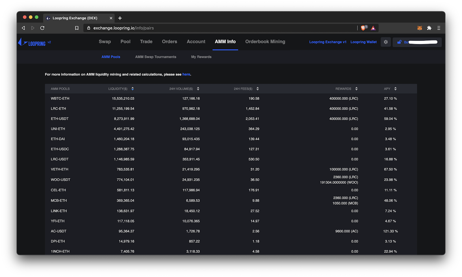 Under the ‘AMM Info’ tab, click ‘AMM pools’. Here you’ll see the liquidity in each pool, the volume, fees earned, and if there are any LRC liquidity mining or other incentive programs.