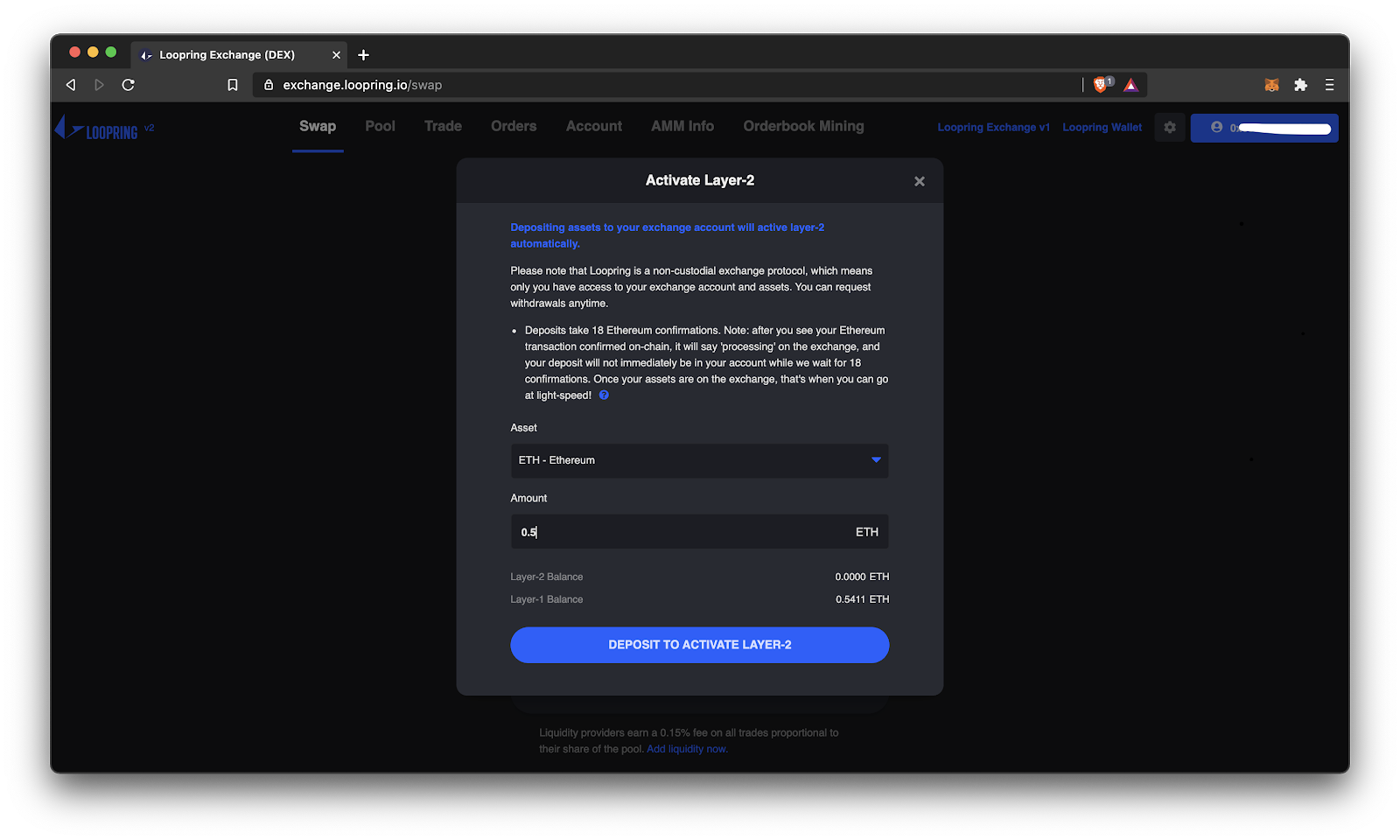 - With your wallet connected, you will see it says “Deposit to Activate Layer-2”. Click that. Choose an asset to deposit, and the amount. Confirm the transaction in your wallet to execute the deposit. After 18 Ethereum confirmations, you’ve made it to the zkRollup!
