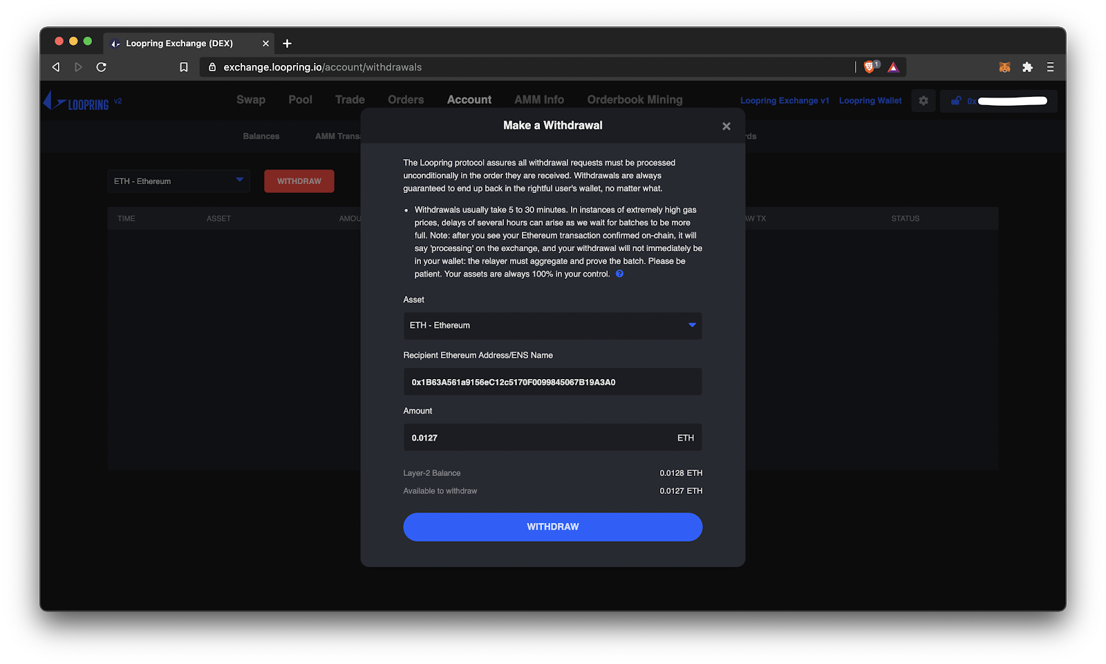 On the ‘Account’ tab, you can withdraw assets from your Loopring L2 account back to Ethereum L1. Remember, a big virtue of zkRollups is that you can withdraw at anytime—your funds can never be stolen, frozen, or seized by Loopring.