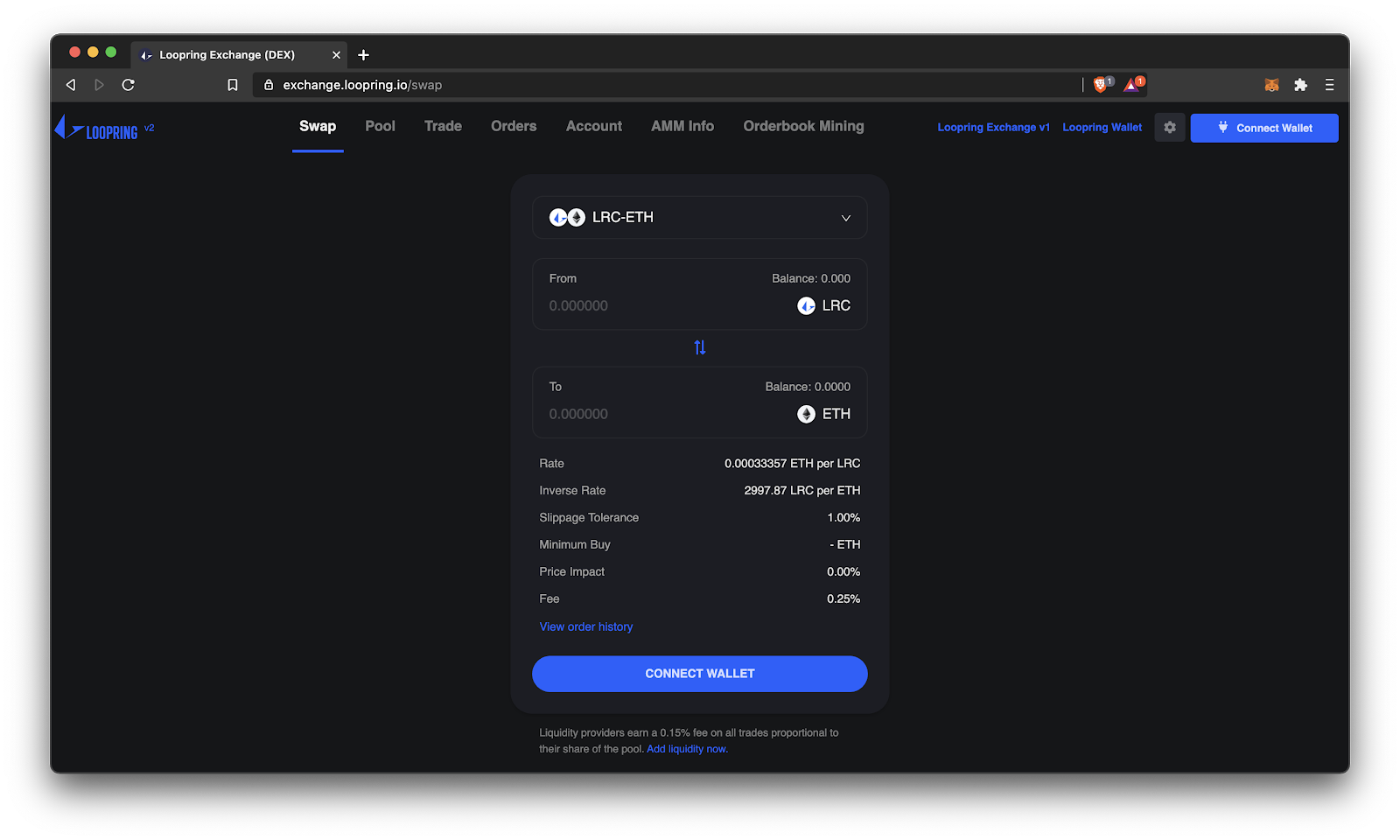 - Head over to Loopring Exchange. Click ‘Connect Wallet’ and link up your MetaMask or a WalletConnect compatible wallet.