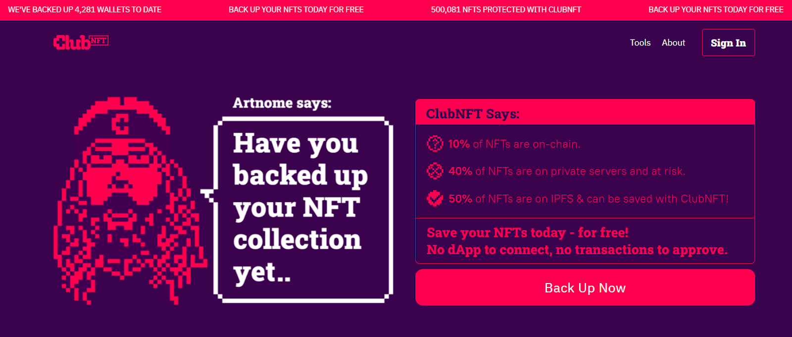 ClubNFTâs NFT backup tool is free, so consider giving it a try to see which of your NFTs have potentially vulnerable media that you can download for redundancy. Yet going forward youâll also be on the lookout as ClubNFT plans to roll out more infra and more resources for aiding NFT users.