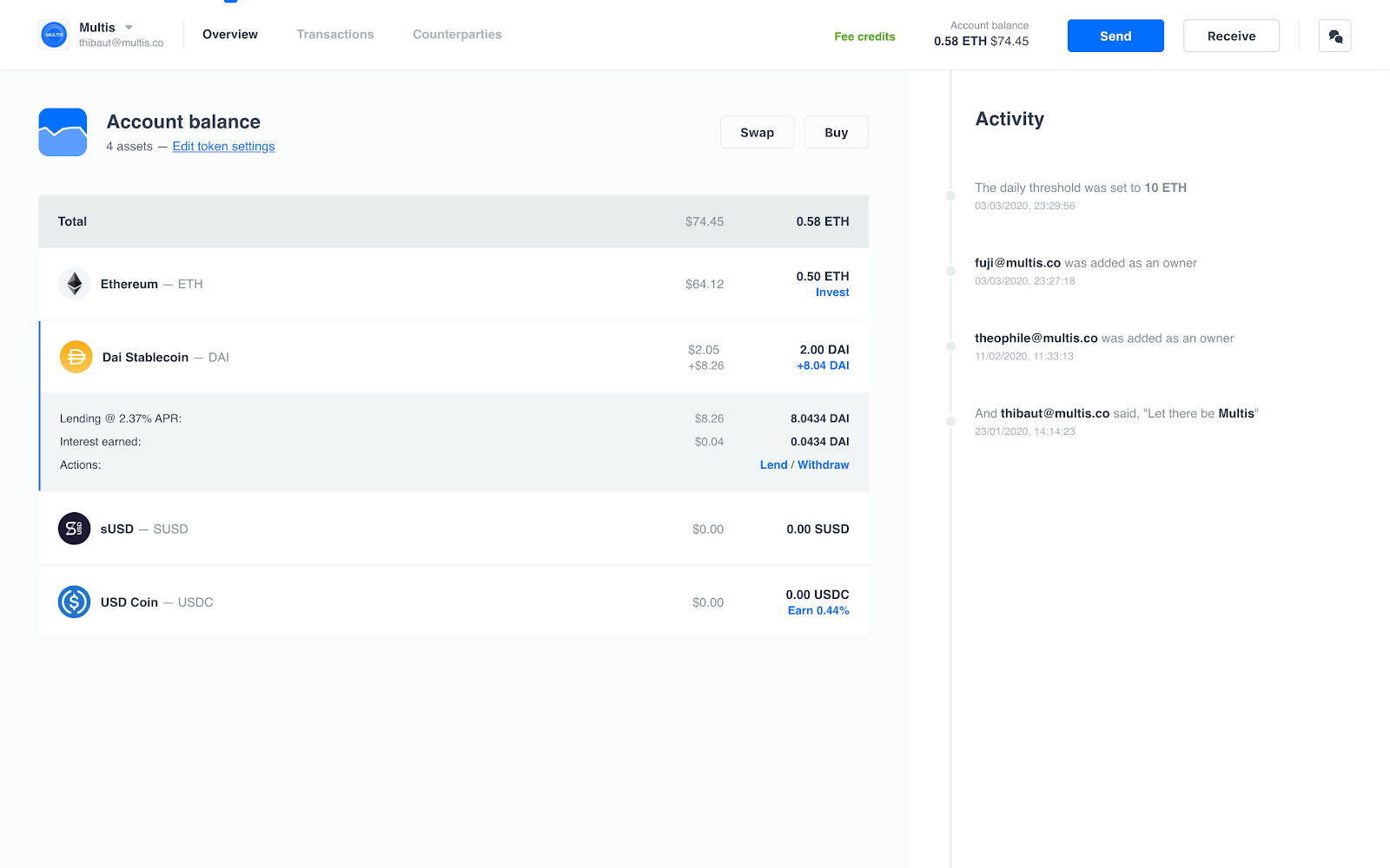 - Goal: Open a multisig wallet for your company, invite teammates to secure funds and make a deposit in stablecoins to start earning interest