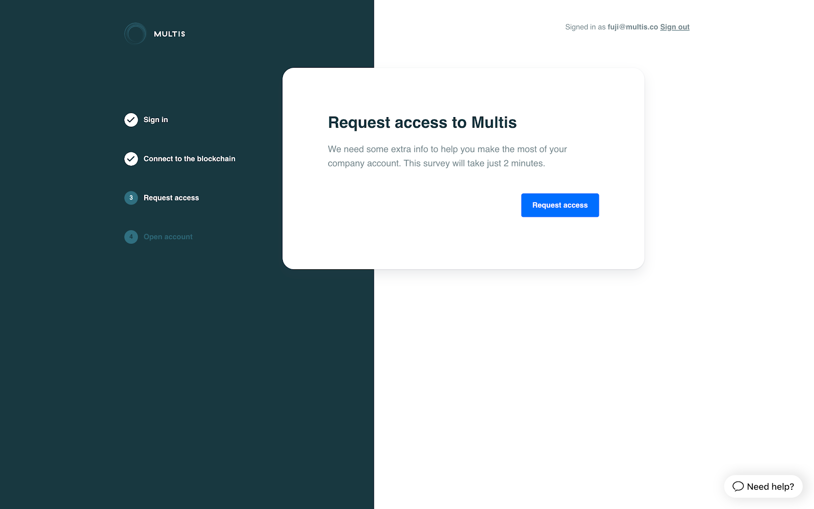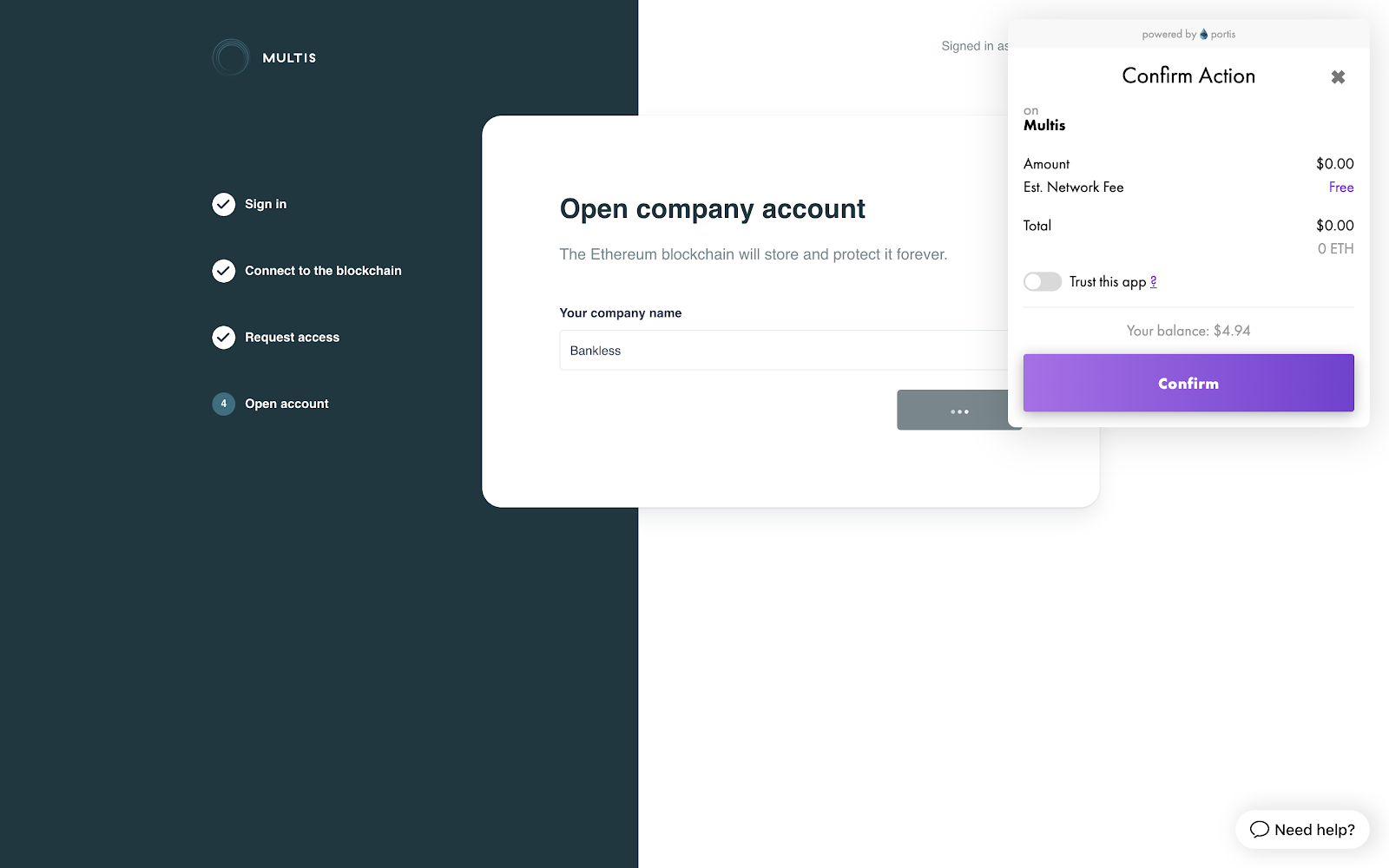 Log back in to app.multis.co once you've received an email confirmation. Hit "request access": Portis will pop up, asking you to connect and sign the transaction. This transaction will create your smart contract wallet. Hit "confirm".