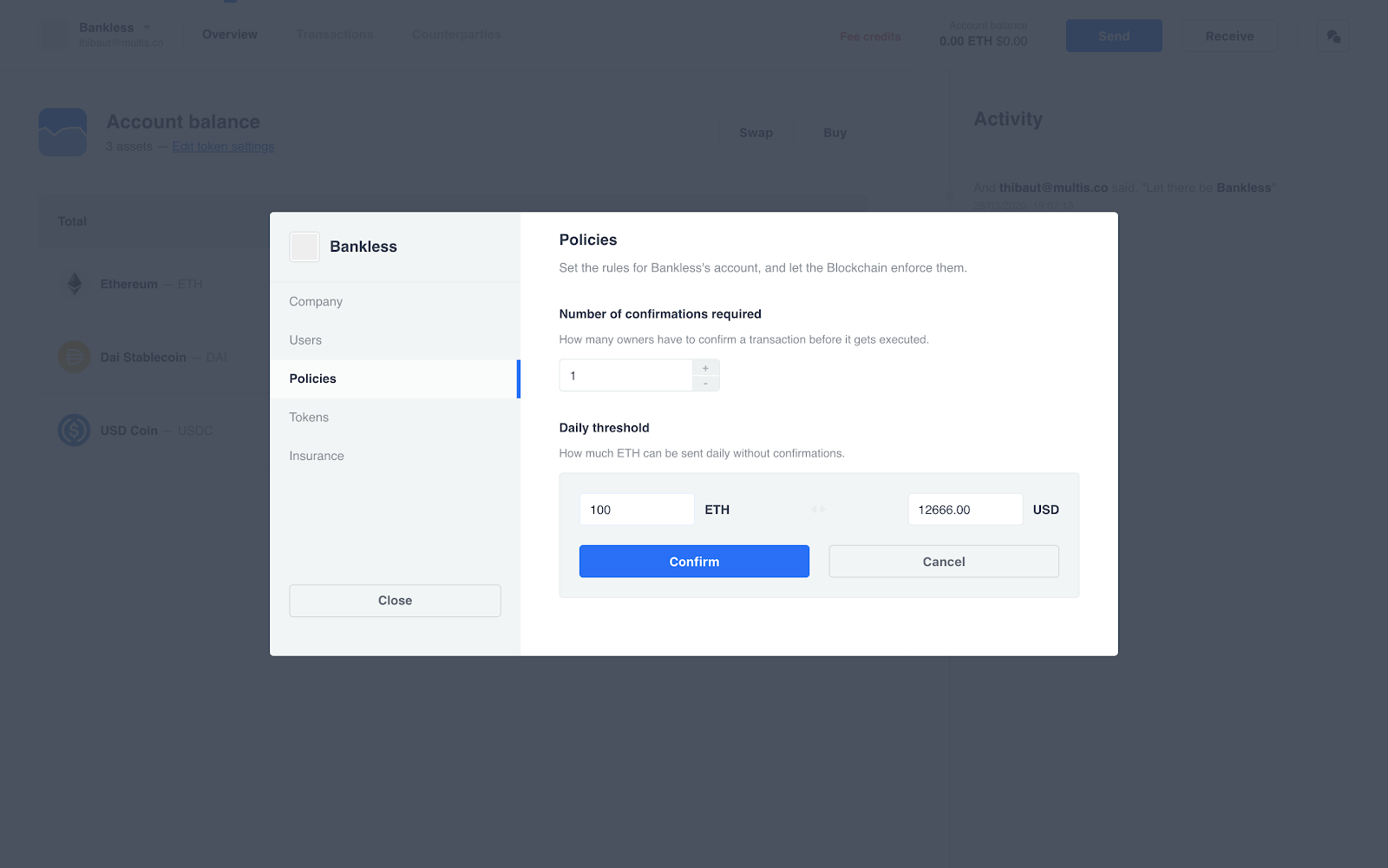 In company settings, go to the "policies" sections and choose how many owners have to confirm a payment before it gets executed. For example, 3 owners should require 2 confirmations to secure funds properly. Each sensitive operation (adding owners, changing policies, sending funds out, etc.) will also require confirmations from co-owners. You can also set up a daily threshold for ETH transactions.
