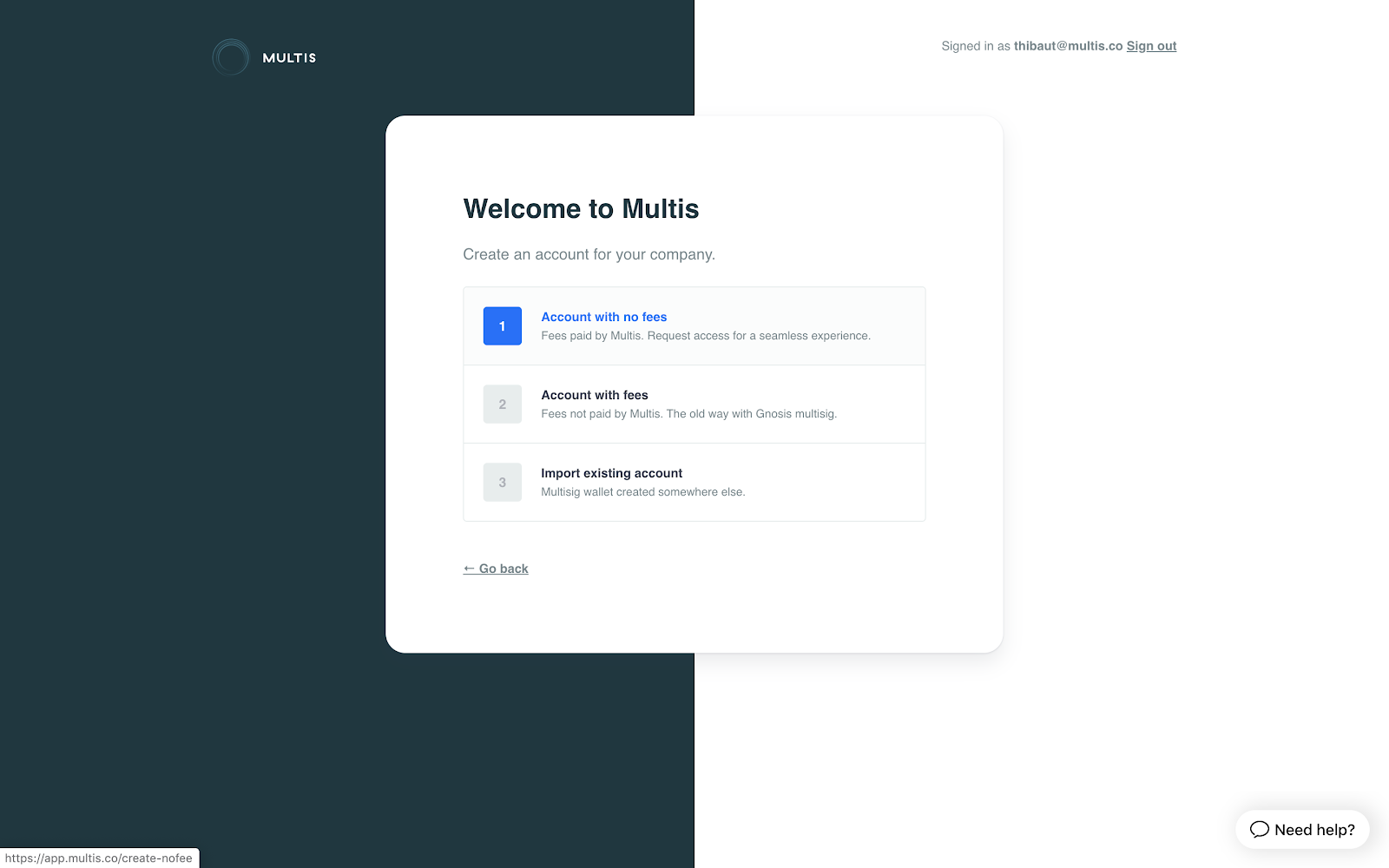 Go to app.multis.co and enter your email address, and click on the link you'll receive. Then simply validate your email address and you will be signed in. You can then enter your company name, and select "account with no fees" (network fees are covered by Multis).