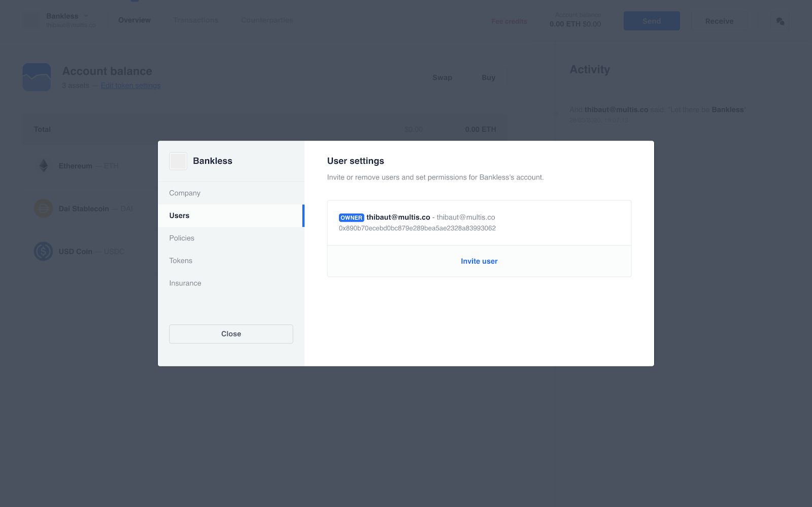 You made it! Best thing to do now is to invite teammates to secure deposits. Go to company settings, then "user" section where you can send email invitations for them to join. They'll have to open a Portis account too, join the account and have you appoint them as owners (ideally, you want to invite 2 extra owners to maximize security).