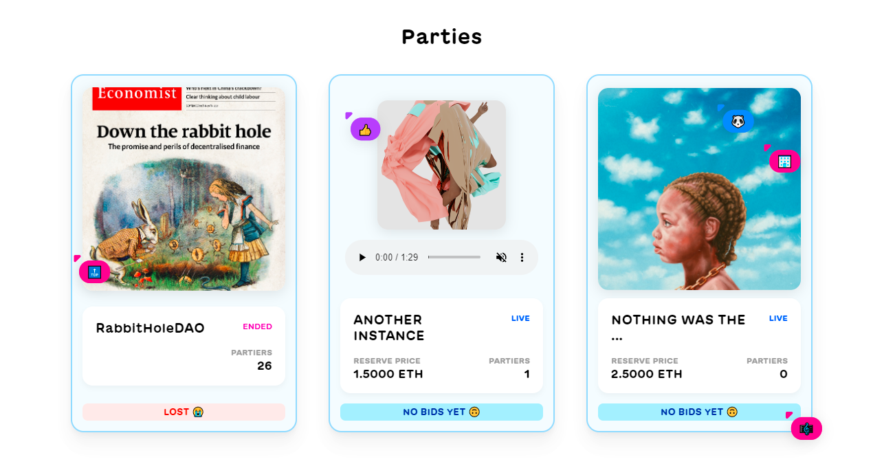 PartyBid is a new application that allows people to group bid on NFTs. Everyone puts in any amount of ETH, and if it meets the reserve price, the application places the bid.