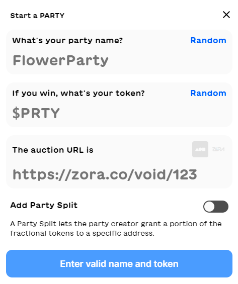 - In the provided interface, input or randomize your party name and do the same for your token name. Then provide a Foundation or Zora URL to an NFT that’s currently on auction. Lastly and optionally, choose if you want to add a Party Split.