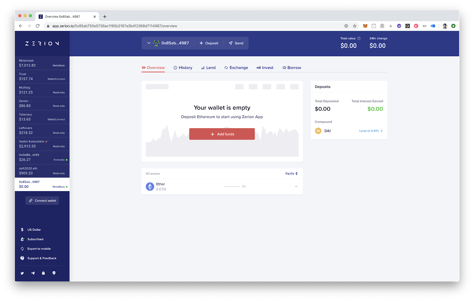 Open Zerion and connect Metamask if you haven’t done it already. If you don’t have any assets on your wallet, it will look somewhat like that: