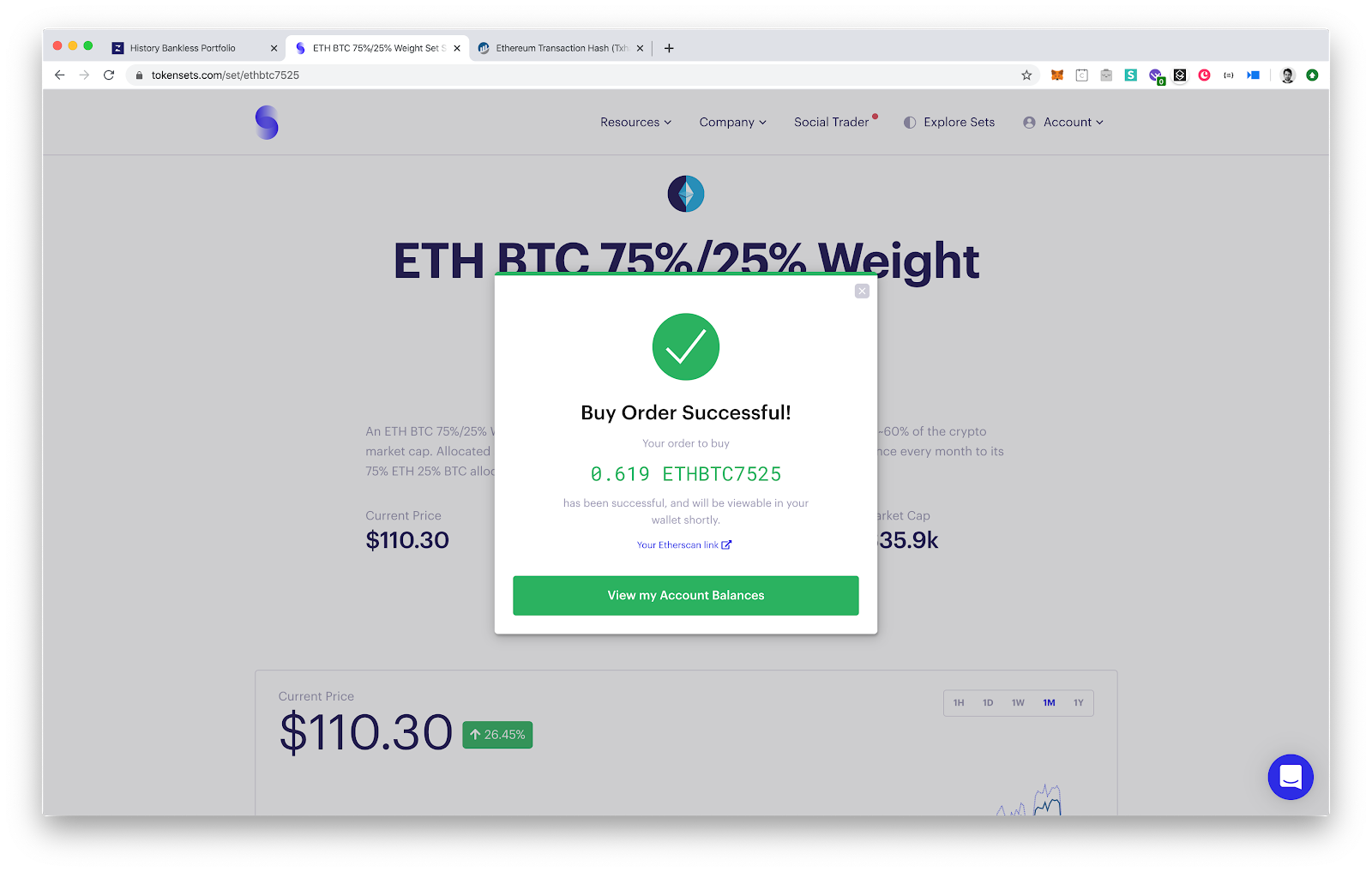 Set tokens are not currently available to purchase directly in Zerion, so we’re going to use Tokensets to purchase ETHBTC7525.