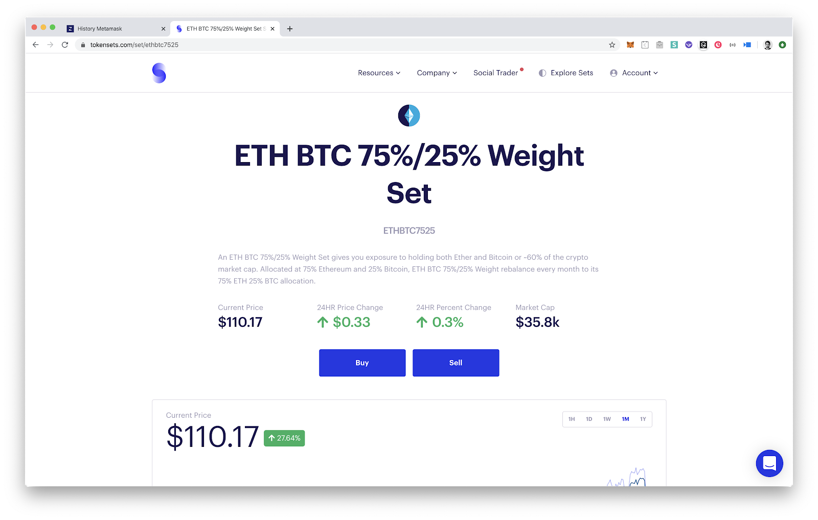 In the list of all available sets, find ETH BTC 75% / 25% Weight Set. Each unit of this Set is going to hold 75% in Ether and 25% in Bitcoin (wBTC to be precise). If the price of one against the other moves significantly, the Set will automatically rebalance to match the target weights.