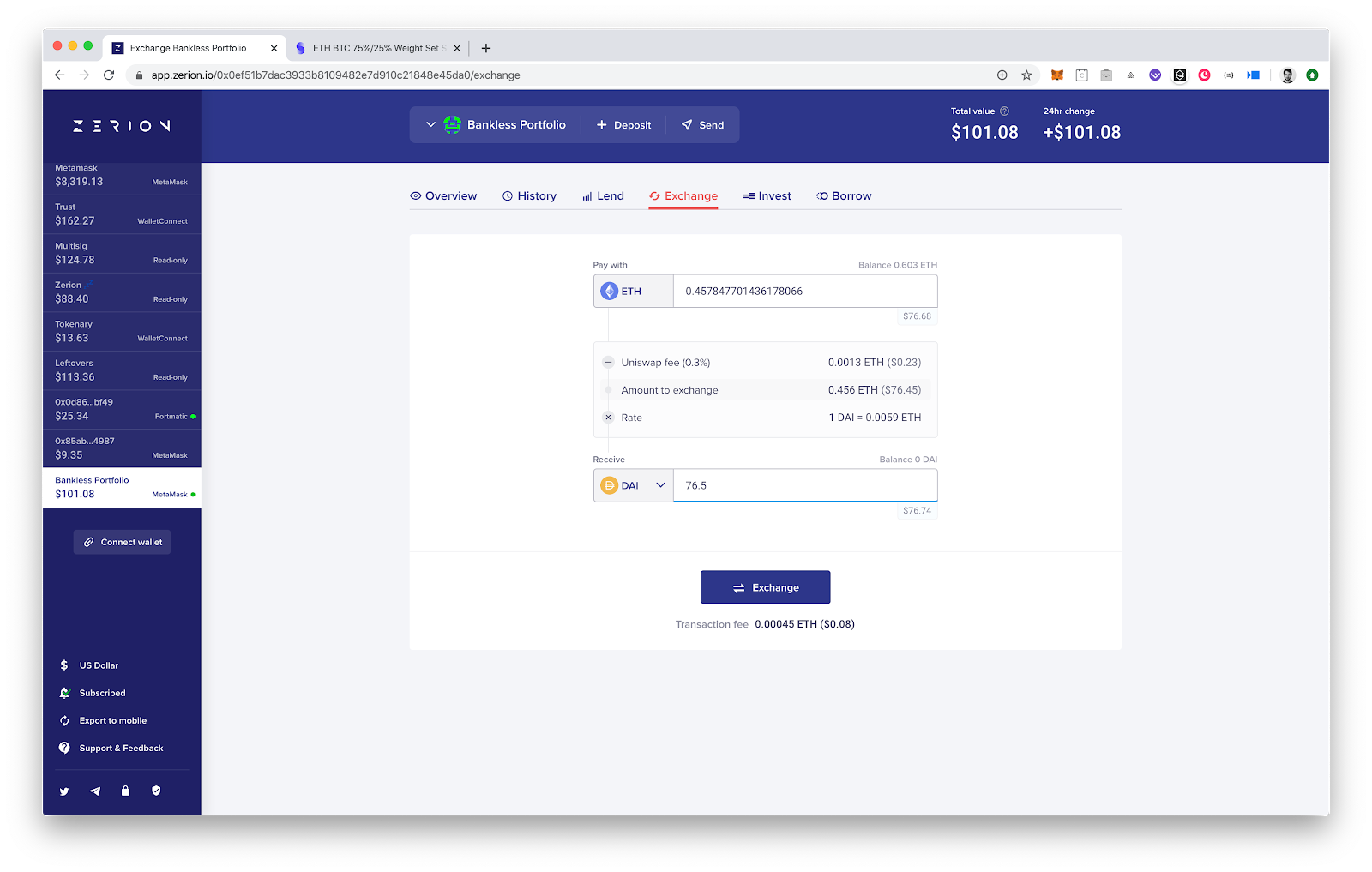 To exchange ETH for DAI you can navigate to the “Exchange” tab, enter 76.5 DAI in the second field and press “Exchange”.