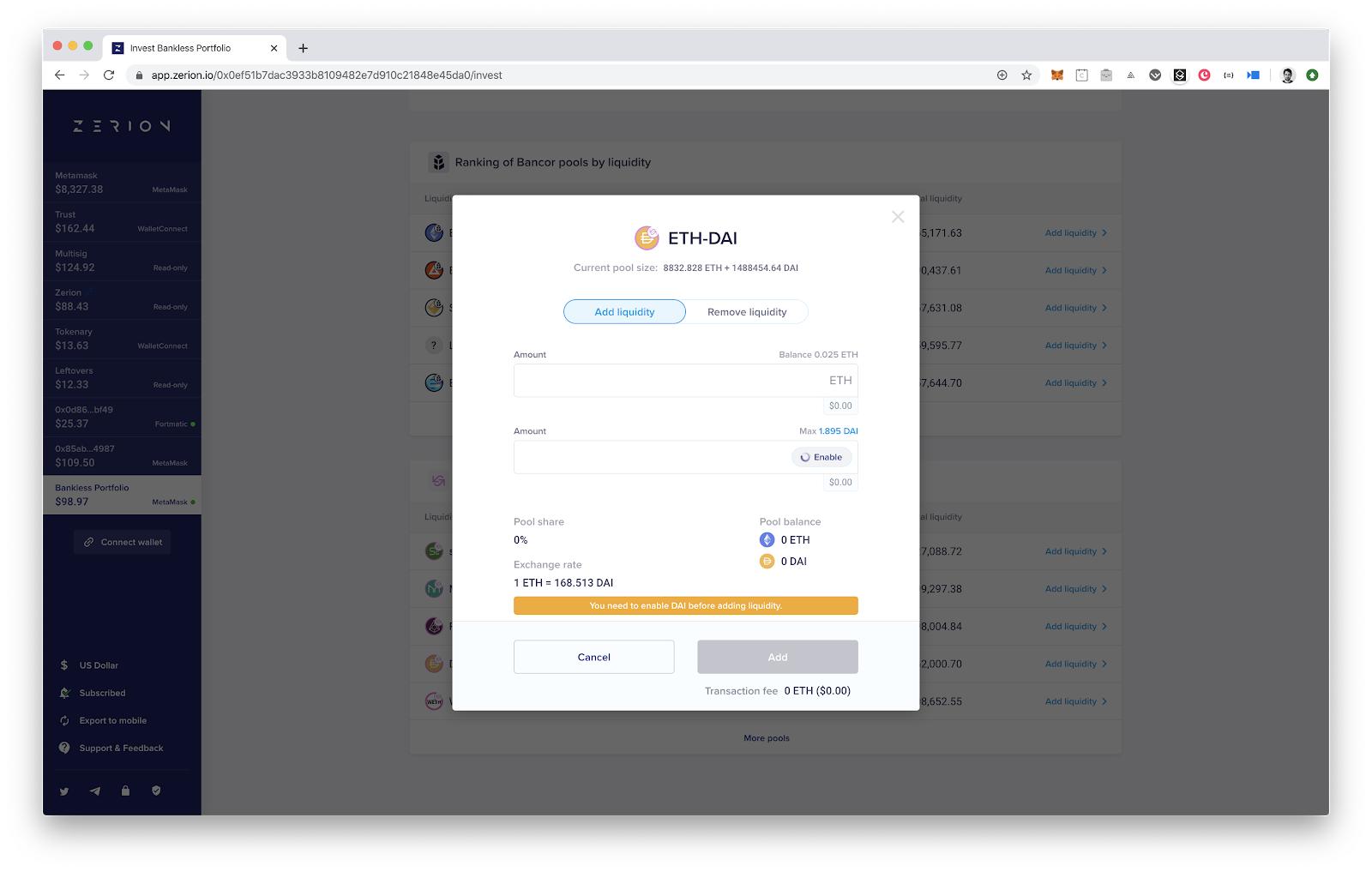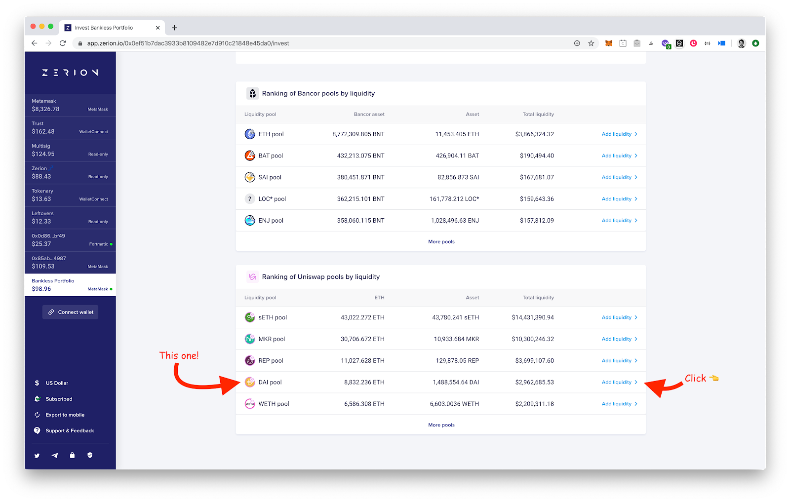 The last thing we need to do to complete the “Bankless” portfolio is acquire Uniswap Pool tokens. To do that, open the “Invest” tab, find a Uniswap DAI pool, and click on “Add liquidity”.