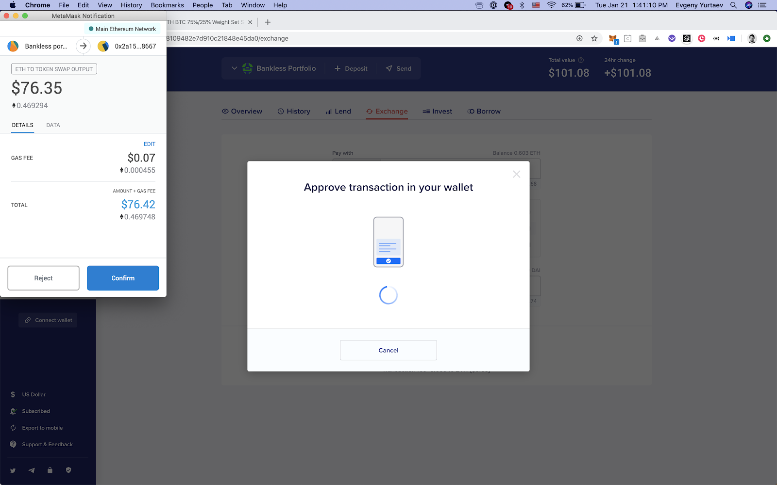 The $105 in Ether in needed in order to buy the assets and transact—about $1 in ETH is needed to pay for gas to assemble this portfolio.