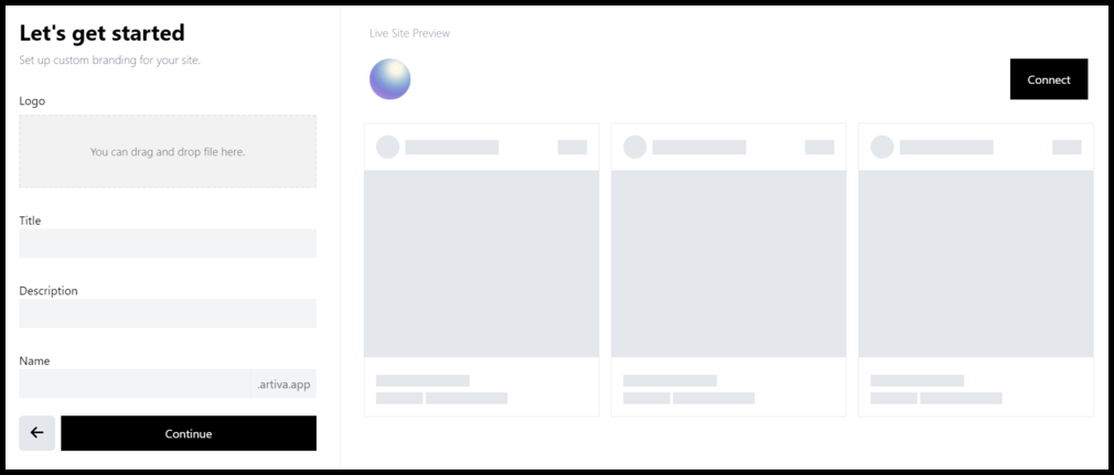 Set up your site’s custom branding by supplying a logo, title, description, and url name. When you’re done press Continue.